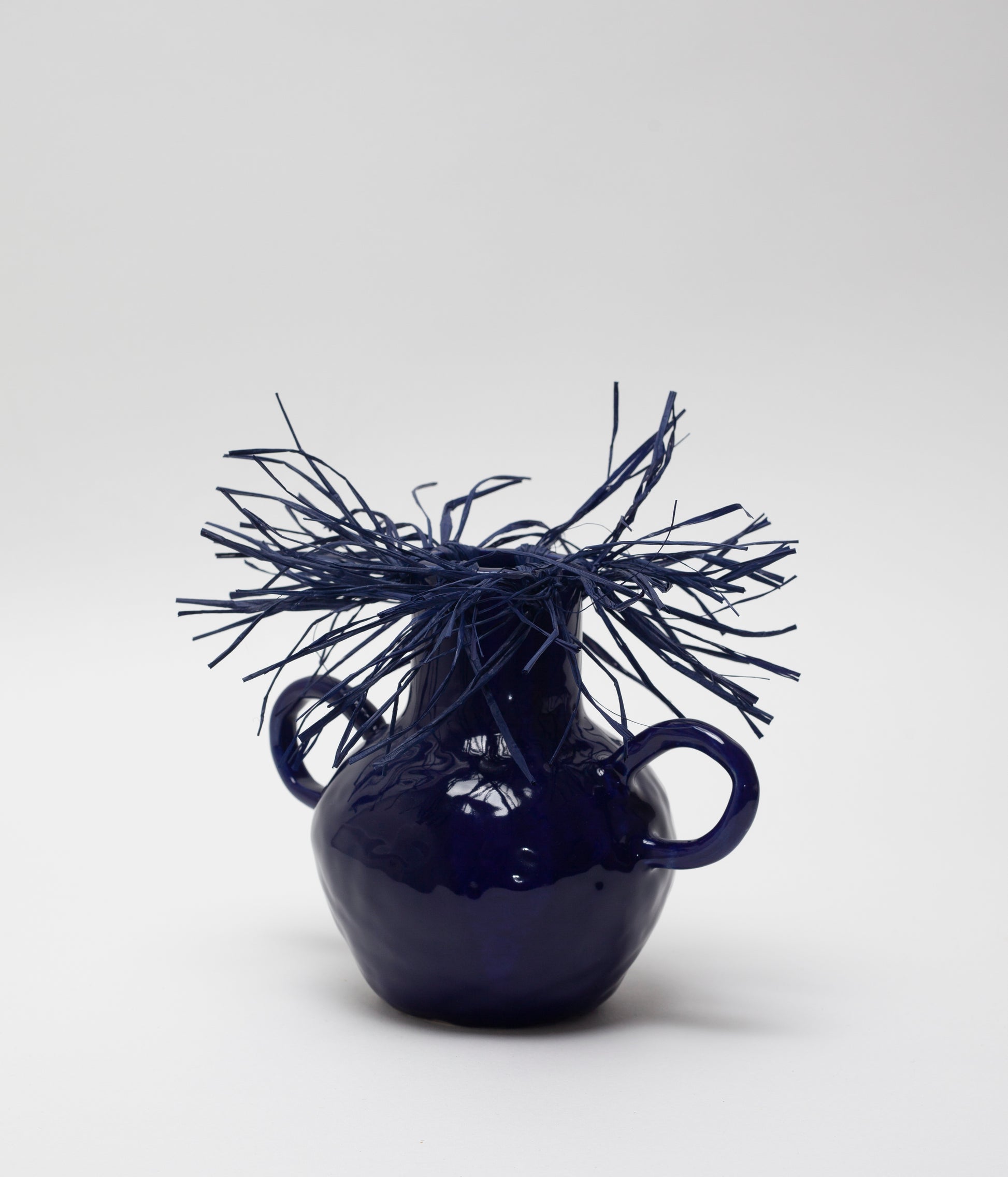- Hand modeled vase in smooth white sandstone with handles and natural raffia