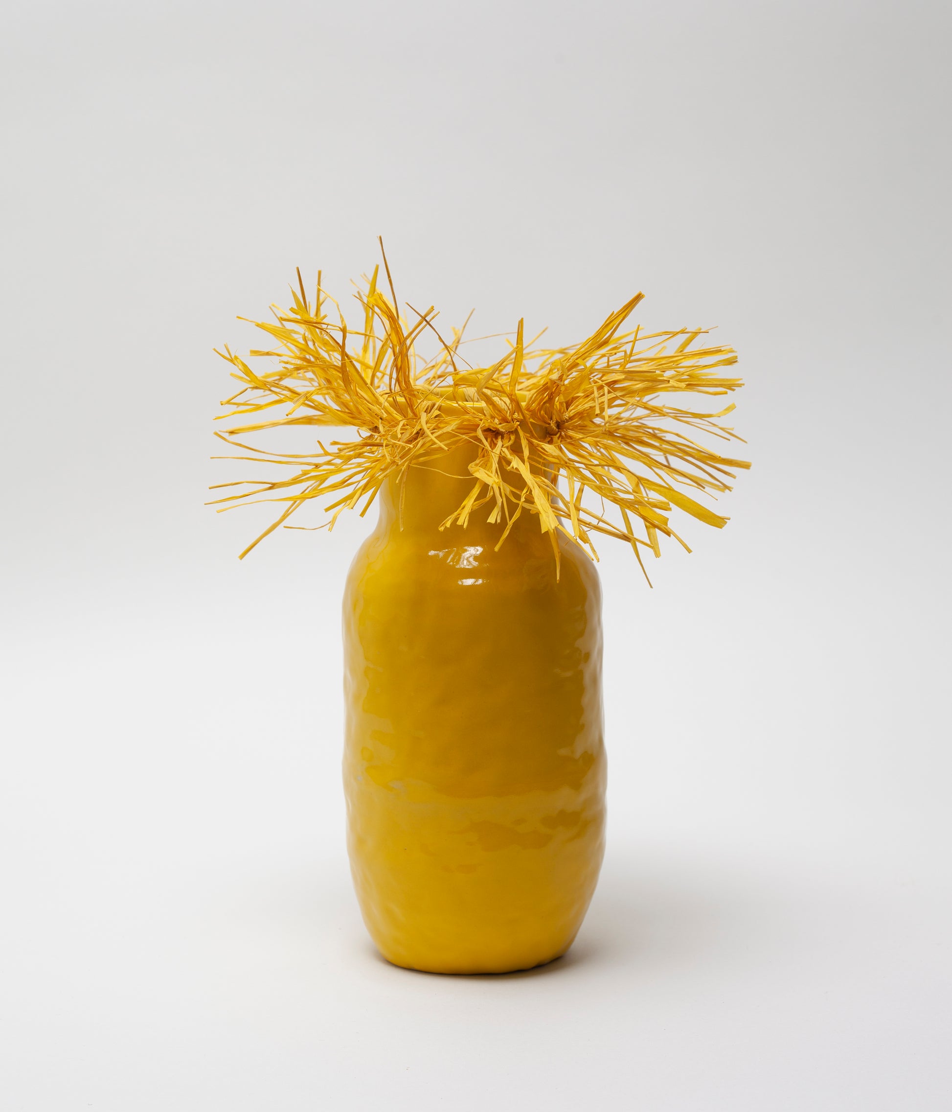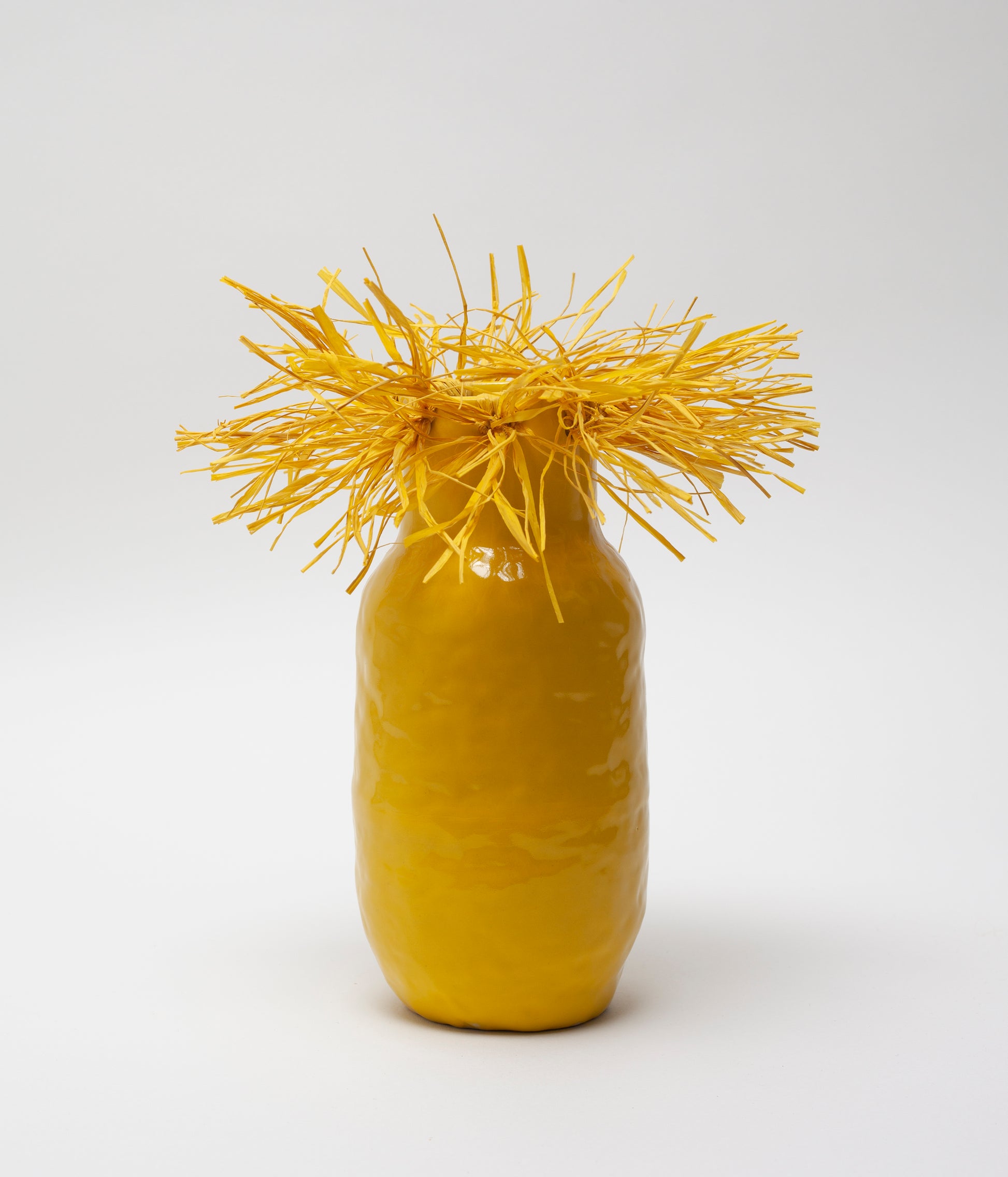 - Hand modeled vase in smooth white sandstone and natural raffia